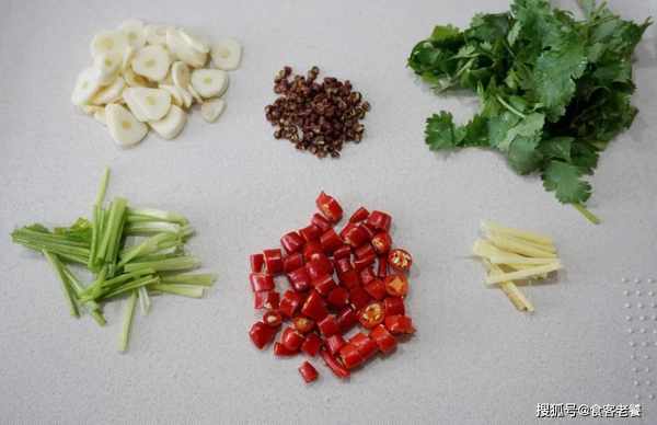4取小米椒、大蒜、生薑、香菜洗凈後瀝幹水分依次切好。