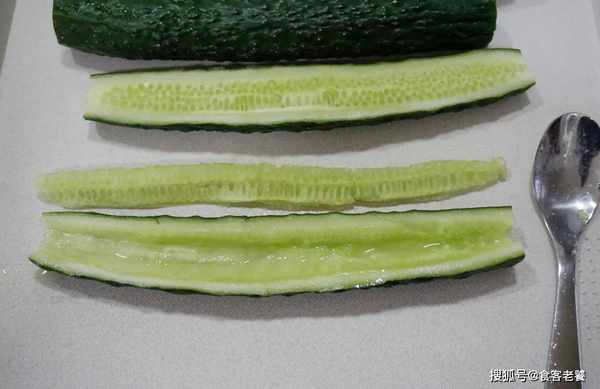 2將黃瓜切去兩頭對半切開,用不銹鋼勺或是小刀去掉中間的瓤。這一步不要省略,不去掉瓤就沒有脆脆的口感瞭。
