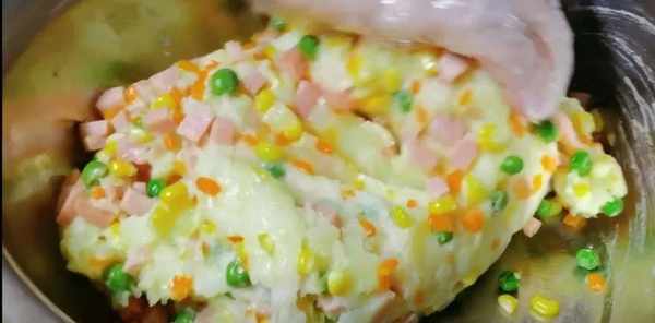 9.再把蔬菜跟土豆泥混合,抓拌均勻即可。