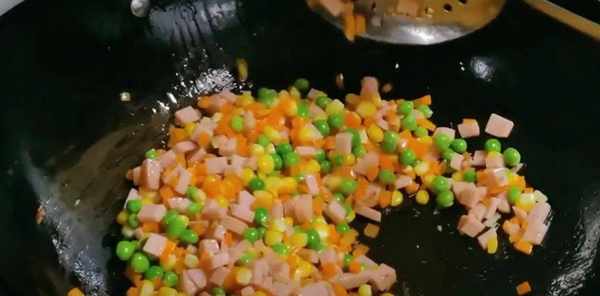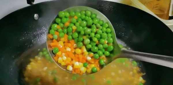 6.然後倒入玉米、胡蘿卜、青豆翻炒幾下。炒出香味。