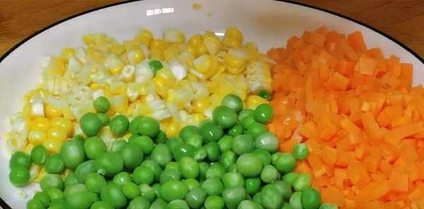4.起鍋燒水,水開加入適量鹽跟油,下入玉米、胡蘿卜、青豆,焯燙五分鐘撈出來備用。