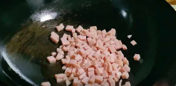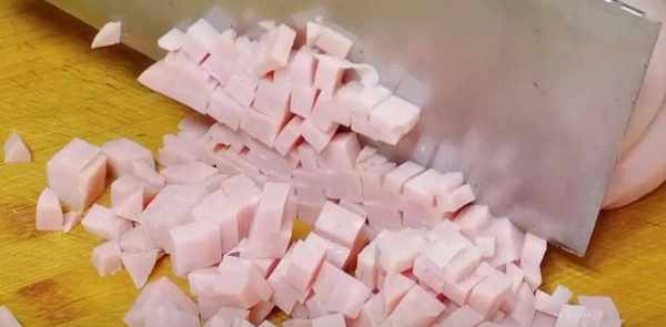 3.再切點午餐肉或者火腿腸,切成丁備用。
