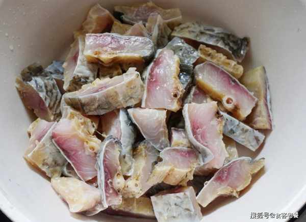 將魚身用水浸泡一晚,再將泡好的魚身剁成小塊,下入白酒和生薑絲攪拌均勻後醃制20分鐘。