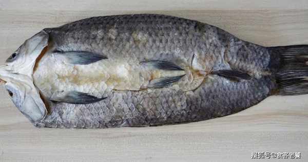 選用幹咸魚,有魚鱗的要先去除魚身上的鱗片。考慮到魚頭部位做酒槽魚不好吃,而魚肚部位最好吃,做酒槽魚未免可惜,所以將魚頭和魚肚部位分別割取下來。