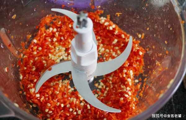 取小米椒洗凈後瀝幹水分,放入料理機打碎。