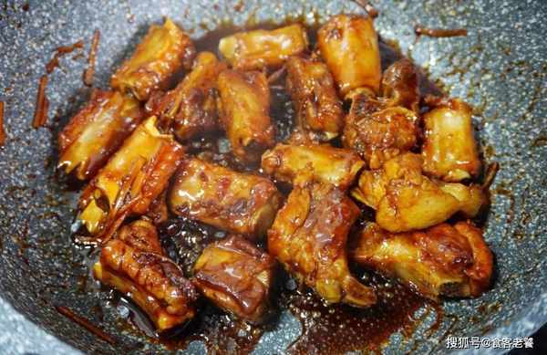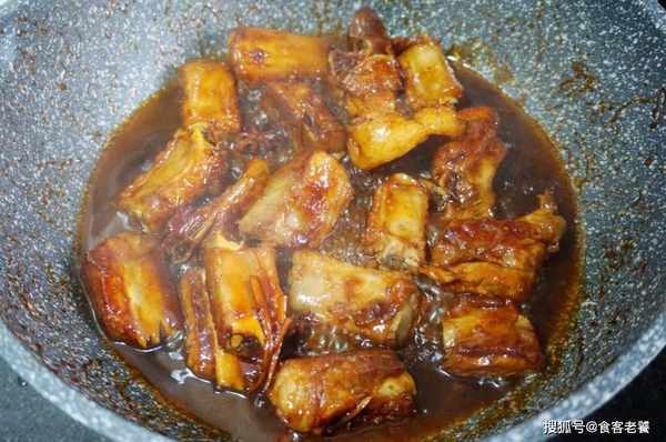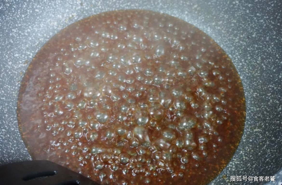 煎完排骨的鍋不用清洗,直接倒入清水,放些冰糖開大火熬糖。待糖化瞭,水燒幹之後,改小火熬糖,熬至慢慢變成咖啡色,快速倒入半碗熱水,讓糖漿和水完全混合,這就算炒好瞭糖色。
