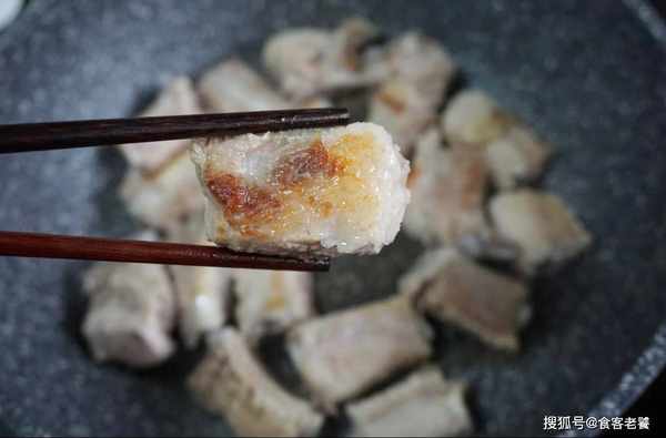 鍋裡不放油,將排骨放入鍋中,兩面煎至表面微黃。這種豬肋排,表面會帶點肥,煎一下會很香。