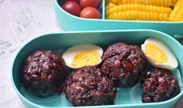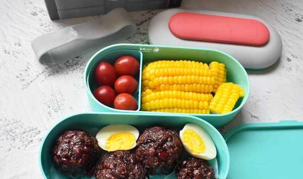 第八步把制作好的粘豆包放入便當盒,玉米和聖女果也放入便當盒。這個便當盒有彈性綁帶,攜帶方便。