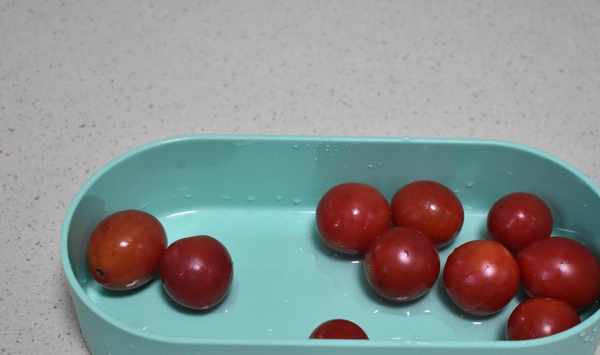 第七步在蒸粘豆包時,洗幾個聖女果,把聖女果擦幹放入便當盒。
