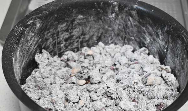 第四步加入100克糯米粉和30克紅棗,紅棗要去核切成小塊,糯米粉的分量要看實際情況,要所有食材都粘上糯米粉,我還分瞭兩次加入水分,把所有食材都能粘合在一起。