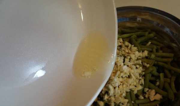 5、水分瀝幹瞭之後將豆角切成小段,然後加入生抽、鹽還有適量的醋和切好的蒜末。