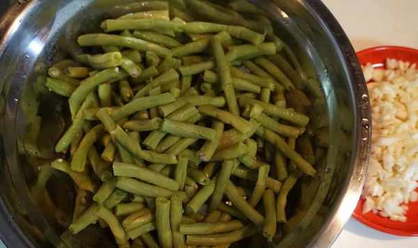 4、煮熟的豆角撈出來瀝瀝幹水分。