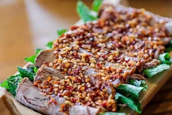 【步驟5】將牛腱切成薄片,卷入薄荷葉,擺入盤中,淋上調制好的醬汁即可食用。