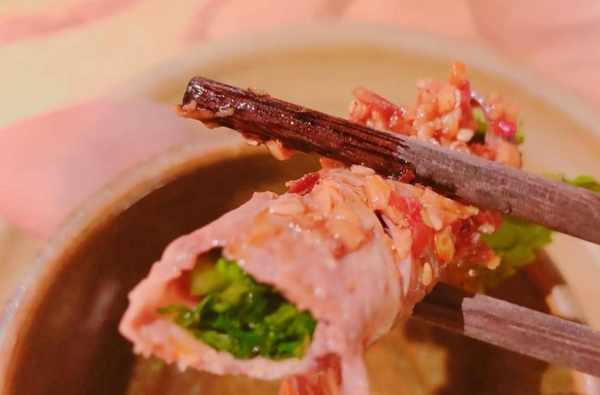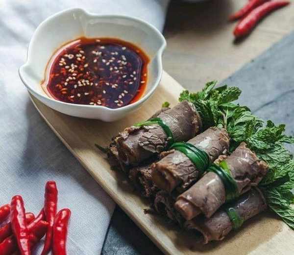 鹵好的牛肉,裡面卷上薄荷葉,再搭配上青檸汁調過的蘸水,清香酸爽又很開胃啊!