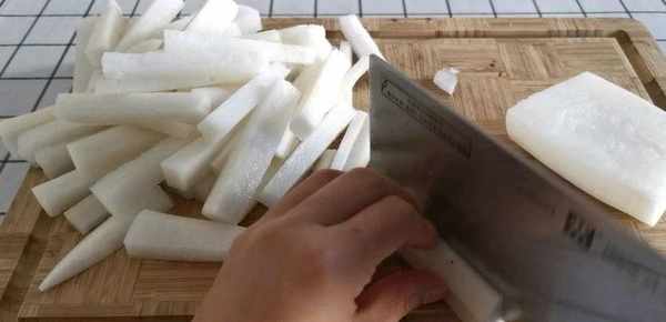 1、先處理蘿卜,清洗幹凈,先取出外皮之後,切成粗細均勻的小條,小條大約1cm左右的小正方形長條就可以瞭。
