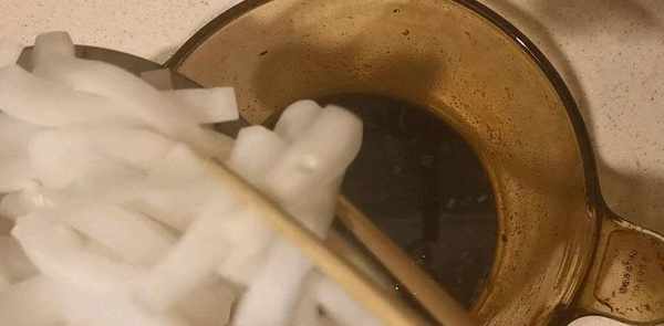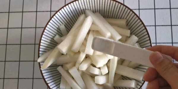 2、切好的蘿卜條,要先用適量的食鹽,醃制一下,去除裡面多餘的汁水,攪拌均勻,醃制大約半小時,去除汁水的蘿卜,就不會在入味的時候有汁水稀釋料汁的味道。