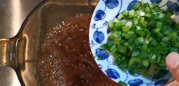 4、然後加入準備好的蔥花下鍋,煮出蔥花的香味,等香味散發出來之後,就可以關火備用瞭。