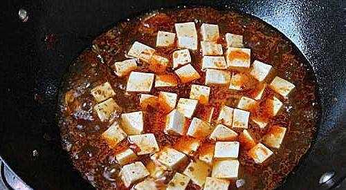 4.倒入適量的水,水開後倒入豆腐,用鍋鏟輕輕拌勻,再用中火將水燒開後煮約3分鐘,勾芡後入味當醬汁濃稠時,如果它是咸的。不夠的話再加一點,用鍋鏟拌勻就可以出鍋瞭。如果覺得不夠辣,撒上一些炒好的辣椒面、花椒面、香油、蔥花,拌勻食用。