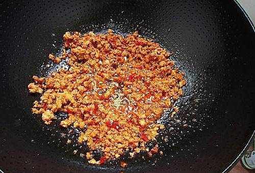 3、鍋燒熱,加油,加入蔥末、薑末、蒜末炒香,加入肉末炒香,再加入紅油1湯匙紅豆,邊炒邊炒紅油。