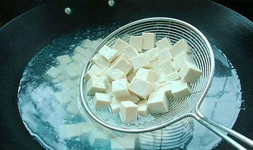 2.水燒開,加入豆腐焯水1分鐘,撈出瀝幹。