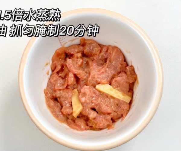 步驟2:牛肉片擱在容器之中,放入一些生薑絲,加上原味醬油少許,加上半勺食鹽調味,加上淀粉適量,讓牛肉被淀粉所包裹,最後滴入橄欖油,鎖住牛肉的水分和營養,炒出來不會粘鍋。