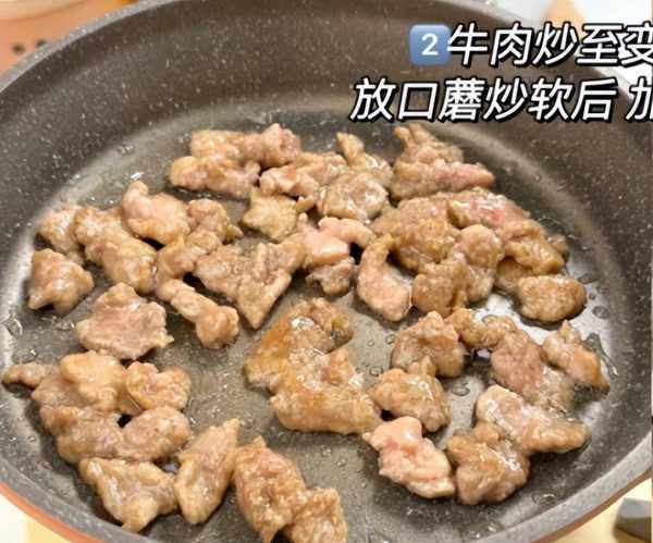 步驟5:鍋中提前預熱一小會兒,加上適量橄欖油,倒入醃制好的牛肉片,大火煸炒至變色,盛出備用。