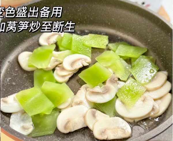 步驟6:鍋底繼續留少許油,加上蒜末和蔥白,倒入口蘑和萵筍片,迅速爆炒至斷生。