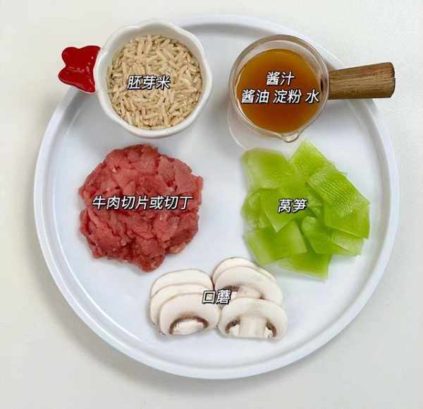 步驟1:提前選購好萵筍,牛肉裡脊和口蘑,提前將牛肉裡脊清洗幹凈,牛肉要切成厚度相同的片,牛肉想要口感嫩,一定記得要提前醃制入味。