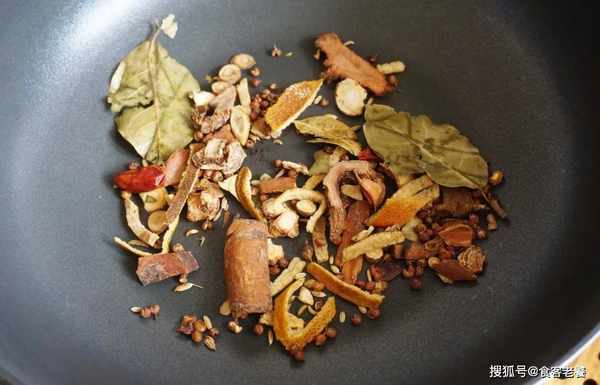 3取小茴香、香葉、桂皮、八角、花椒、肉蔻、幹辣椒、陳皮、山楂等大料,放入鍋中煮半分鐘撈出放入凈鍋中,用小火慢炒,炒好後的香料用紗佈小袋狀裝好綁緊備用。這一步可以激發出香料的味道,也能把附在香料上的臟物煮掉。