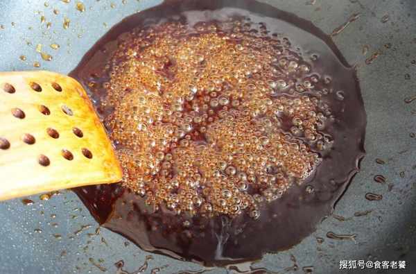 4鍋中放水和冰糖,加熱至糖融化,待融化後一直攪拌,直至水分變少,從大泡變小泡,糖的色澤也隨之加深。一直攪拌成深金黃色,快要變咖啡色時,快速倒入半碗熱水,讓糖漿和水完全混合,就意味著糖色炒好瞭。