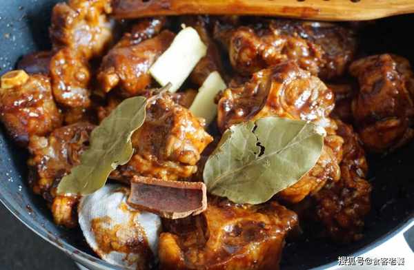 5將郫縣豆瓣醬、黃豆醬、黑胡椒醬和豆腐乳混合成的醬料放入鍋中翻炒,再將瀝幹水分的牛尾放入,翻炒至上色。再把香料包、香葉、生薑和生抽放入鍋中翻炒均勻。