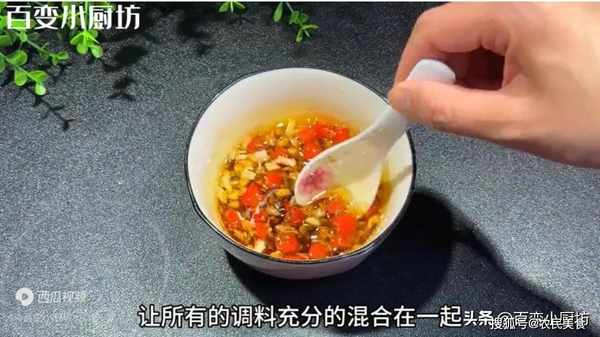不喜歡吃辣的或者是不能吃辣的朋友,那麼就可以不用放小米椒,或者是少放一點。接著淋入剛燒熱的熱油,用熱油可以充分的激發出小米椒還有大蒜的香氣。兩勺生抽,一勺香醋,少許香油,一勺鹽,幾粒白糖,半勺雞精,用勺子攪拌攪拌,讓所有的調料充分的混合在一起,這樣一個簡單的料汁就調好瞭。