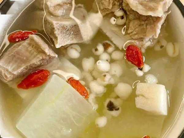食材準備:豬骨頭、冬瓜、薏米、土茯苓、芡實、薑片、蔥段、枸杞子。