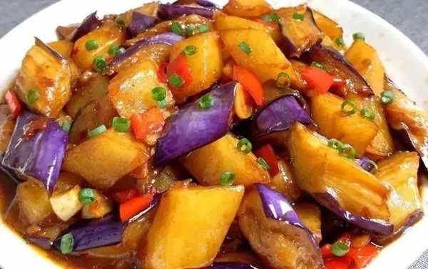 (5)再放入土豆翻炒斷生,再放入茄子翻炒片刻,再倒入調好的料汁,開大火,將食材翻炒均勻,至食材熟透入味,收汁關火。