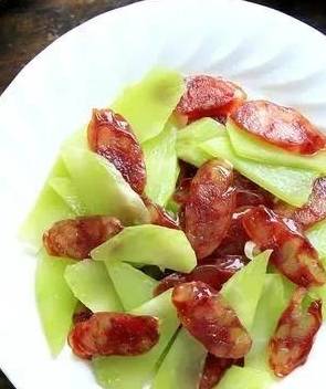 ?食材:萵筍2個、廣式香腸2根、獨蒜1隻、植物油、生抽1大勺、鹽少量、雞精適量