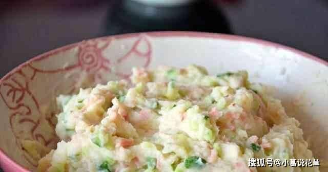 黃瓜搗爛,鍋中倒入水,土豆去皮切丁蒸熟,過程中將玉米粒煮熟,香腸和黃瓜切丁,經常檢查土豆是否煮熟,取出完成烹飪後將土豆取出。壓泥,然後倒入玉米粒、火腿粒、牛奶(牛奶不要太多,否則擠不出來)和千島醬拌勻,攪拌均勻後成團。你可以把黃瓜切片,鋪在盤子裡,然後把土豆泥放在黃瓜上面。也可以把黃瓜挖空,把土豆泥放進去。