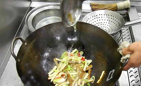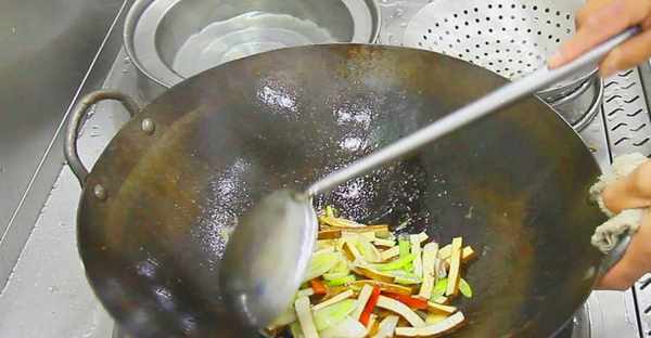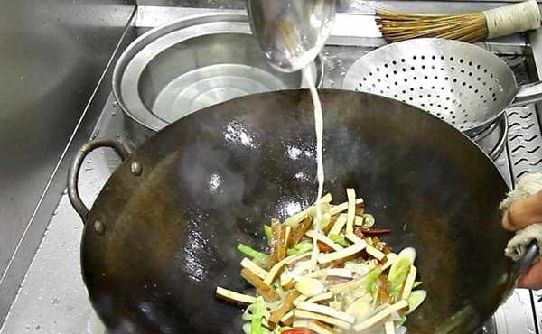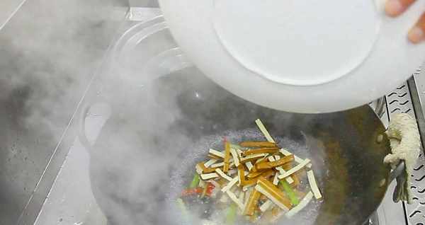 適當地勾入水淀粉,快速翻炒,勾入水淀粉的目的不但是為瞭快速收汁,並且還能把調料更好地裹在豆腐幹上,使湯汁更濃鬱。