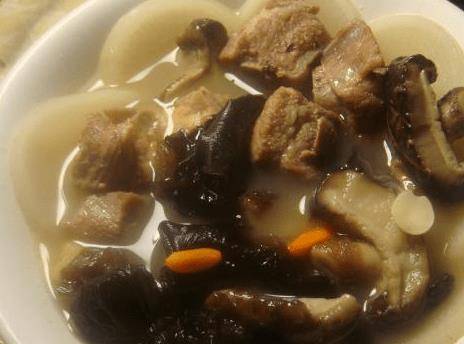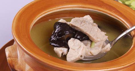 黑蘑菇和排骨一起煮。女人多吃。可補鐵,促進血紅蛋白合成,增強造血功能,補氣血。特別適合體質虛弱、貧血的女性食用。同時可以補水,提亮膚色。改善膚質,防止皮膚粗糙,延緩衰老,使皮膚粉嫩。