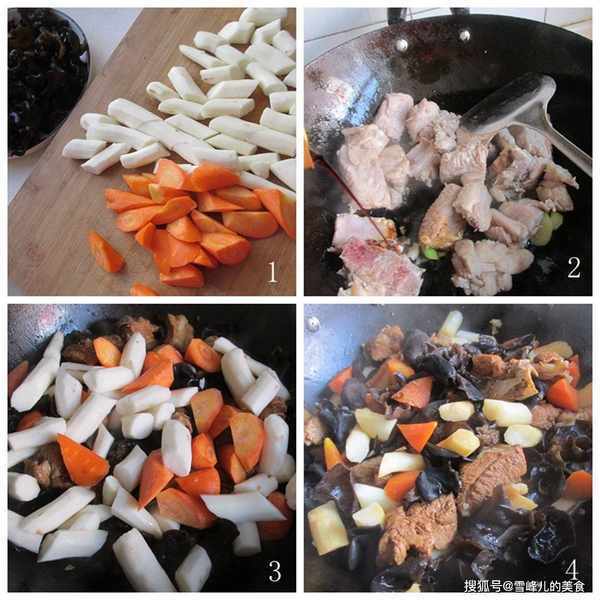4,再加入胡蘿卜和山藥,加入鹽小火慢燉大約10分鐘,山藥,黑木耳,胡蘿卜都熟透瞭,就可以關火,出鍋瞭。