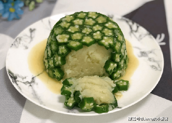 最後把秋葵土豆泥倒扣在盤內,澆上剛煮的料汁,這道美味就做好瞭。