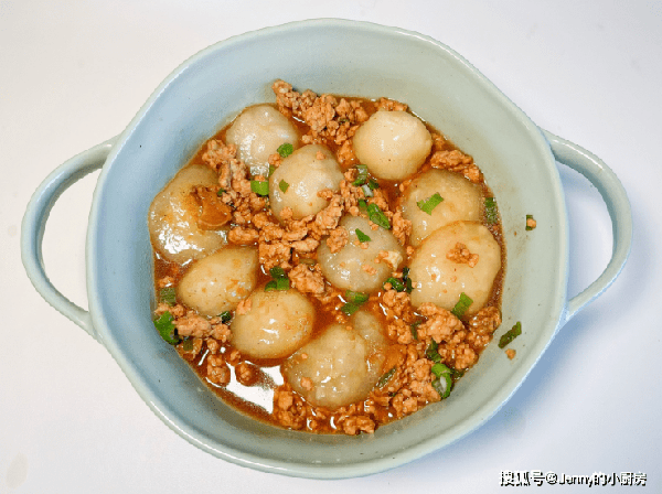 最後放入蒸好的山藥丸子,再稍微收收汁就可以出鍋瞭,盛出後撒點蔥花點綴。