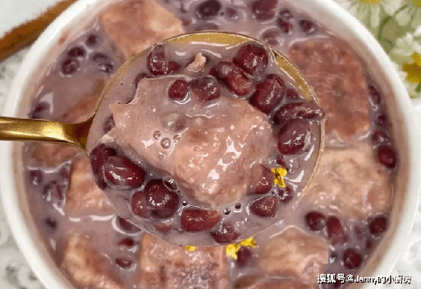 紅豆清洗一下,放進電飯鍋,加入適量清水,點煲粥按鈕,煮到紅豆軟爛。