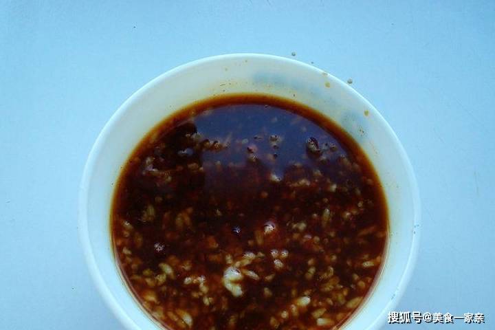 4、煎豆腐的時間,可以取一小碗,倒入甜酒湯,辣椒醬,生抽,再加清水混合成醬汁