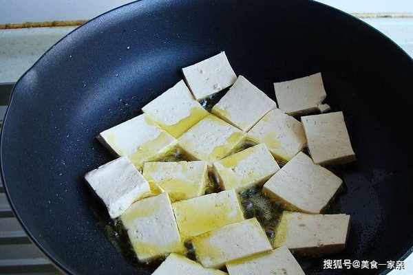 3、熱鍋涼油,加精鹽燒至5成熱時下豆腐,下火煎到兩面金黃時盛出。這樣豆腐好入味也不沾鍋