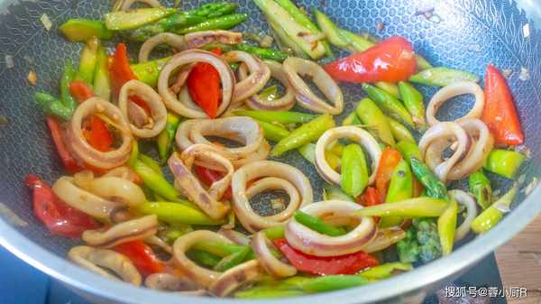 蘆筍300克、魷魚圈400克、紅辣椒1個、蔥、生薑