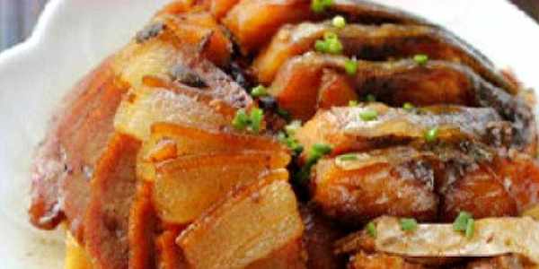 4、上層碼放好山藥段,置於蒸鍋裡大火煮半小時取出,將碗倒扣在盤裡,撒上少許小蔥末即可。