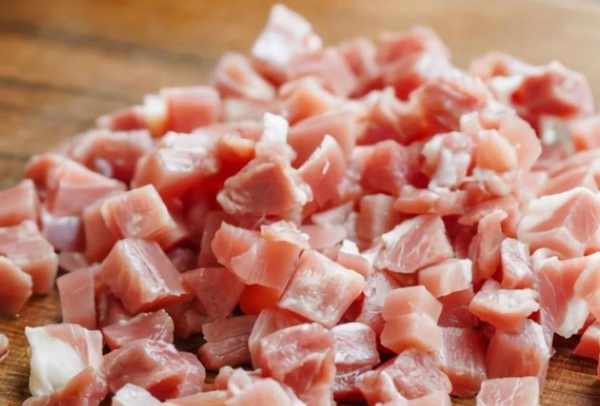 第二步,咸肉一塊,切成丁,換成臘腸、臘肉等都行,待將所有的食材都準備好,在鍋中添上少許的食用油,將咸肉丁先放入在鍋中;