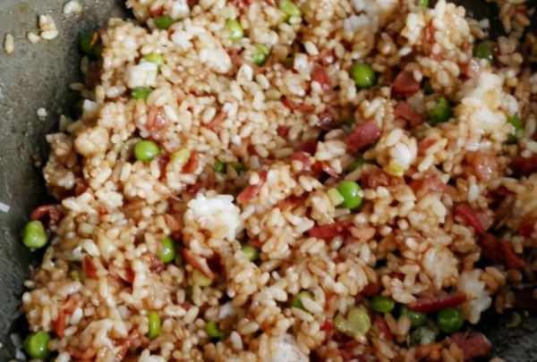 3、要事先將各種食材炒一炒,再加上水燜煮,這樣燜飯的香味才會更好,做這款燜飯不要像平常燜大米飯時放太多水,因為食材自身有水分,水太多米飯會發粘,不喜歡糯米可以換成大米,按照個人的喜好來選擇,因為要當作主食吃,所以調味盡量淡一點。