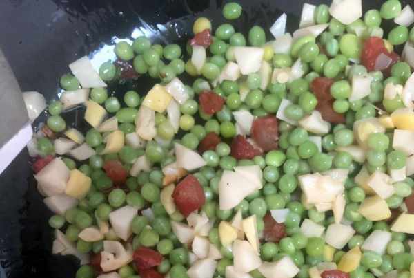 第三步,快速煸炒下,將咸肉的油脂炒出,香味散發出,這個時候將筍丁和香菇丁一同下入鍋中,快速下,加上一點點料酒,然後將豌豆粒放入;