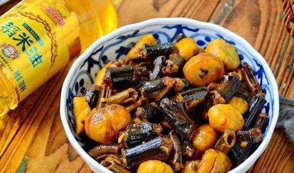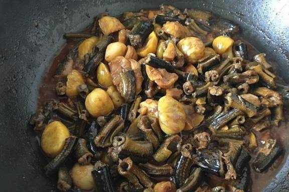 7.放入板栗翻炒均勻,小火燉十五分鐘。